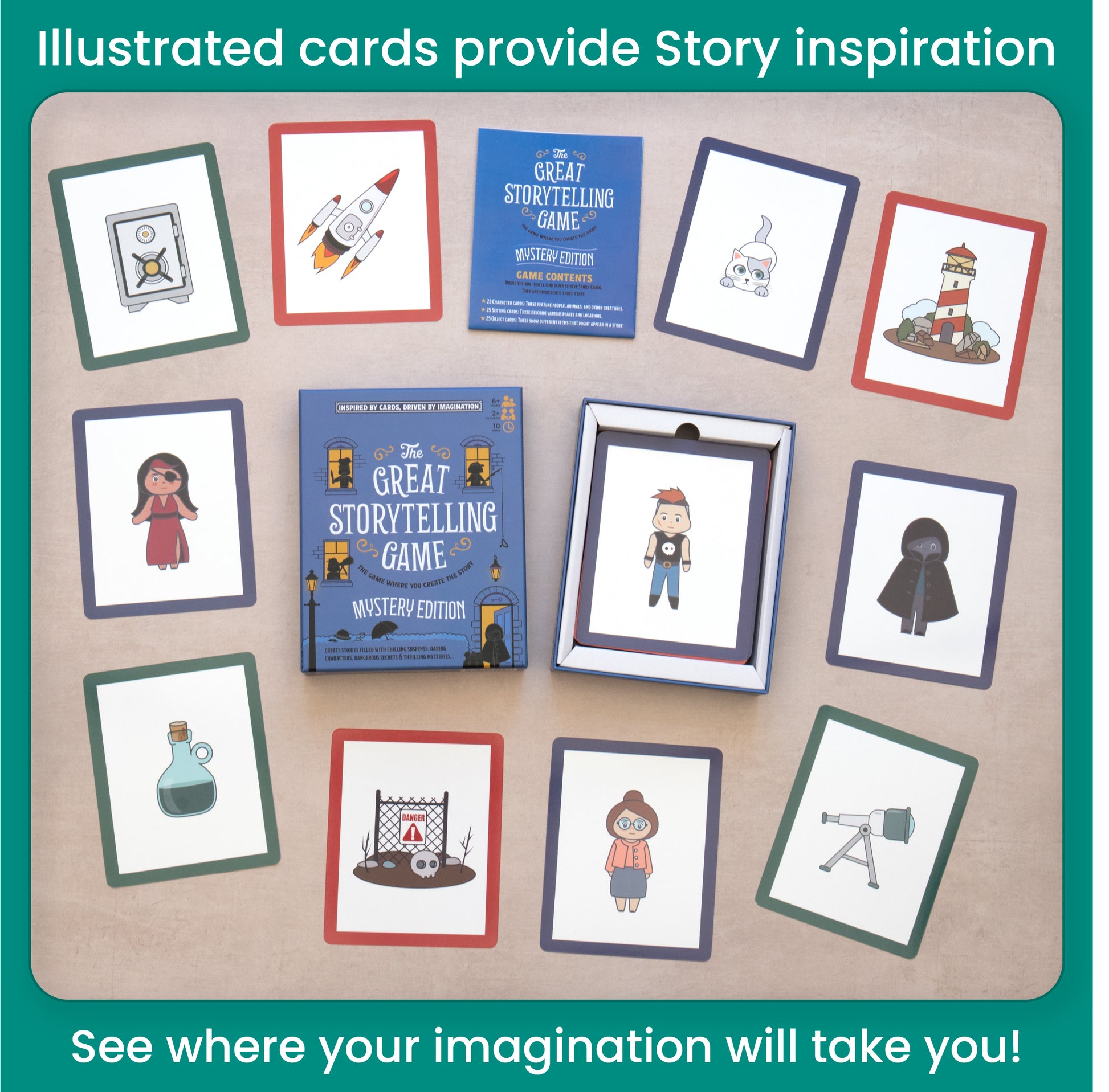 Contents: 25 Character cards, 25 Setting cards and 25 Object cards, all with a Mystery theme. Instructions including Starter Stories to help kickstart your creative adventure